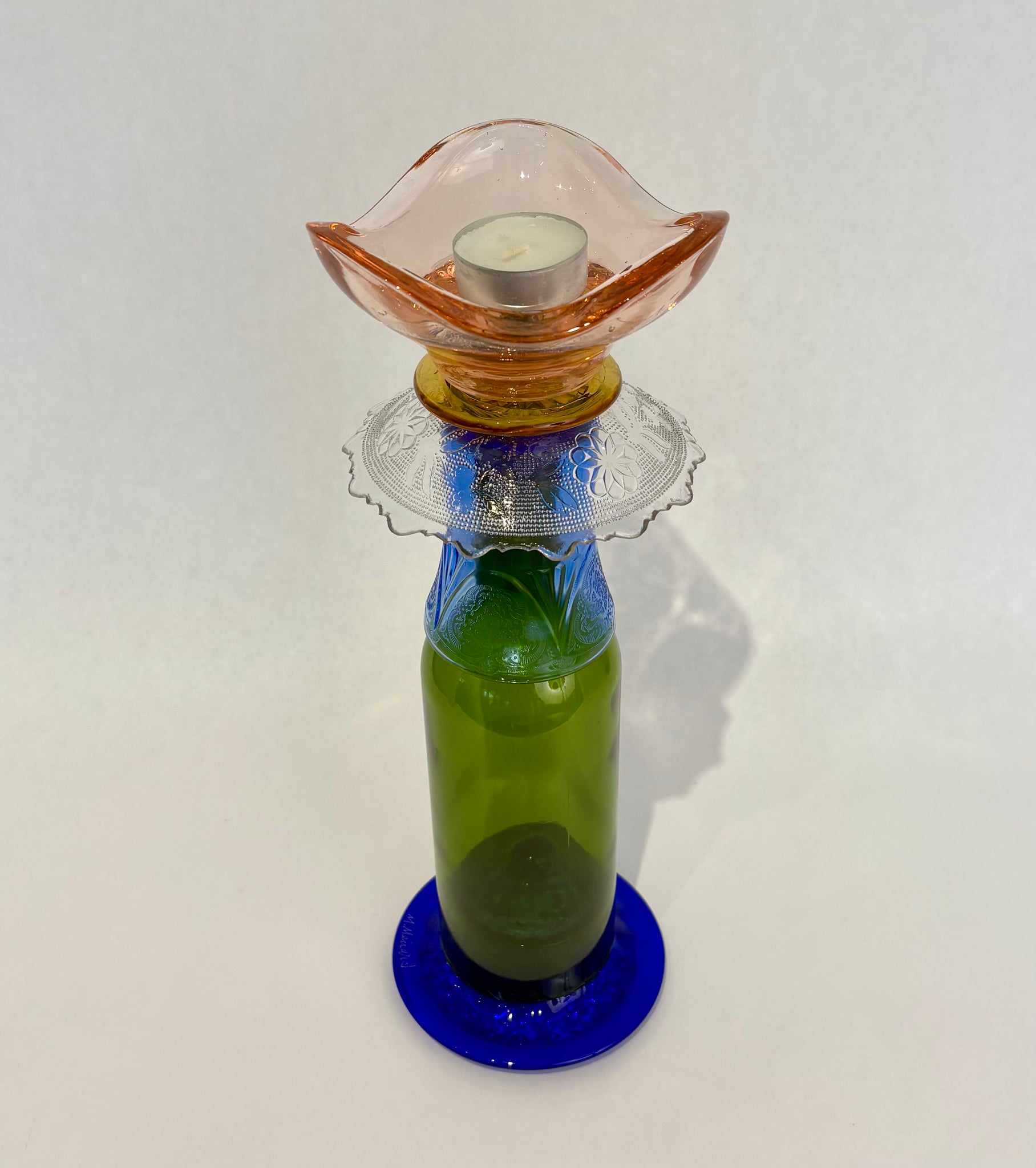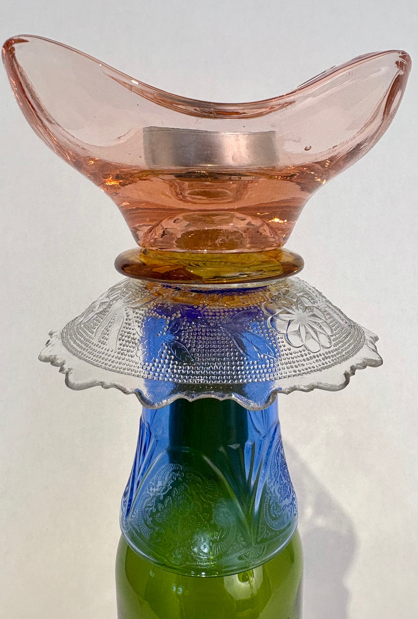 Grande empilade réalisée à partir de verrerie usagée portant fièrement la trace d'une vie bien remplie. Chaque élément a été choisi dans les bazars et brocantes des environs. Le tout a été soigneusement assemblé afin de donner vie à cette petite sculpture de verre qui pourra colorer la lumière dans votre décor.