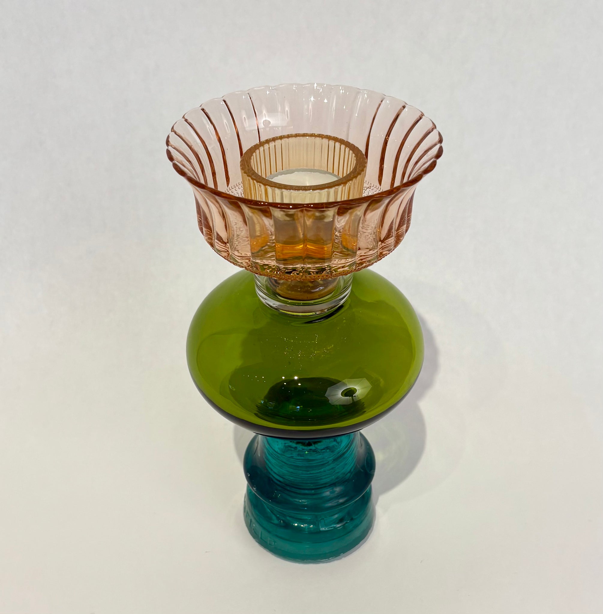 Moyenne empilade réalisée à partir de verrerie usagée portant fièrement la trace d'une vie bien remplie. Chaque élément a été choisi dans les bazars et brocantes des environs. Le tout a été soigneusement assemblé afin de donner vie à cette petite sculpture de verre qui pourra colorer la lumière dans votre décor.
