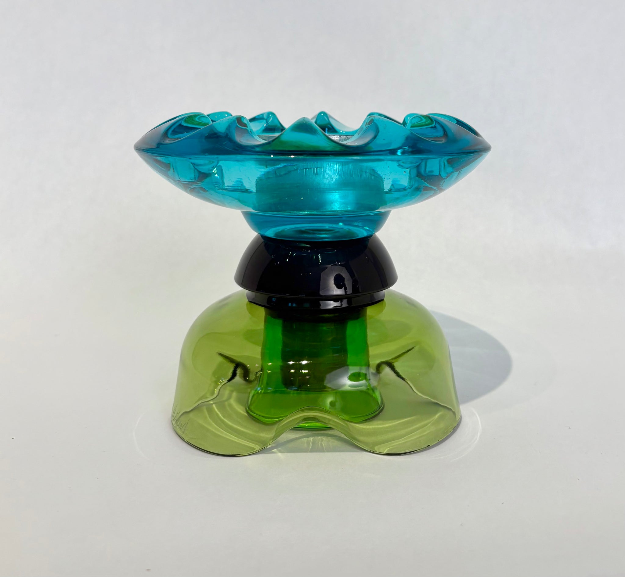 Empilade réalisée à partir de verrerie usagée portant fièrement la trace d'une vie bien remplie. Chaque élément a été choisi dans les bazars et brocantes des environs. Le tout a été soigneusement assemblé afin de donner vie à ces petites sculptures de verre qui pourront colorer la lumière dans votre décor.