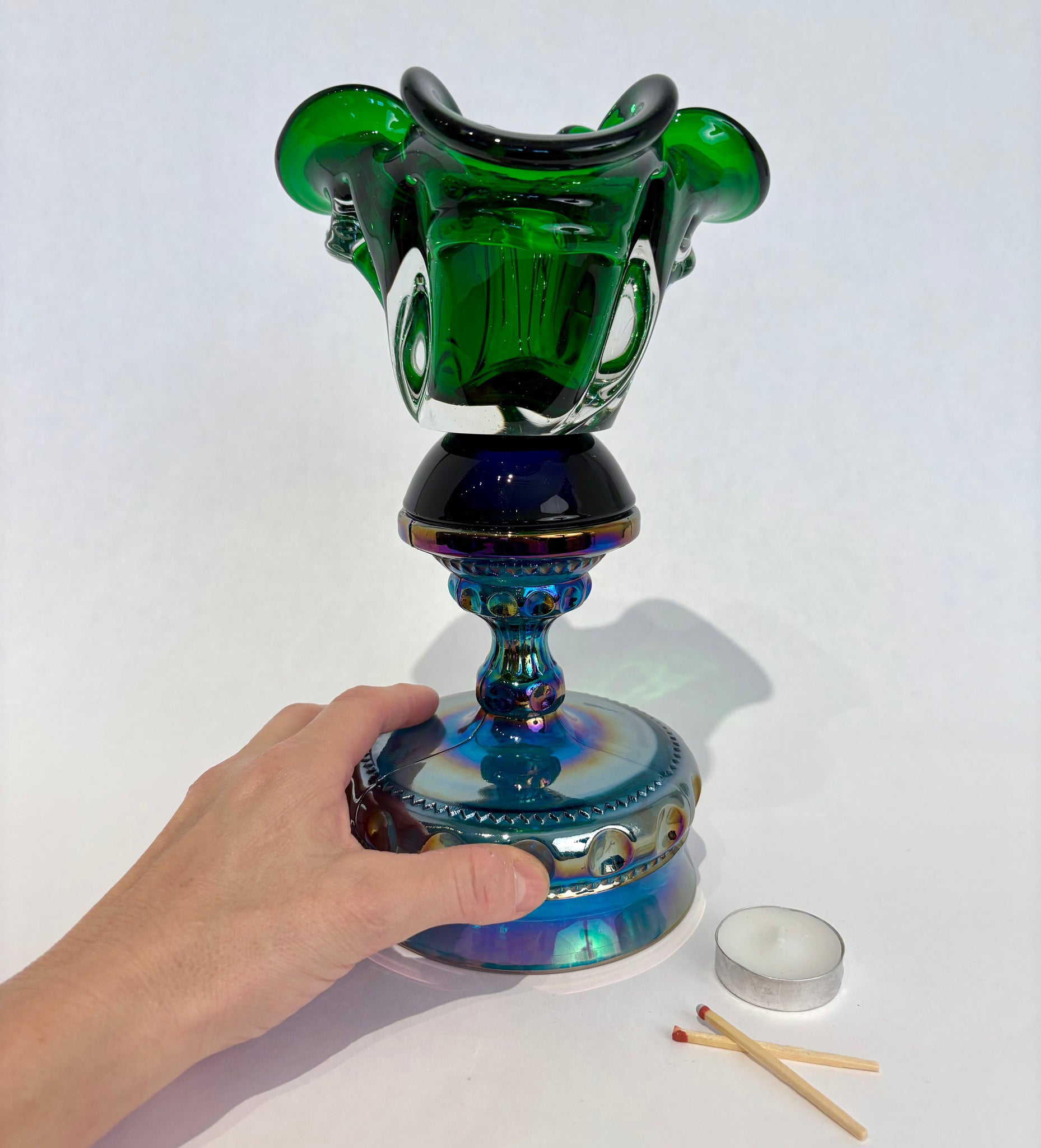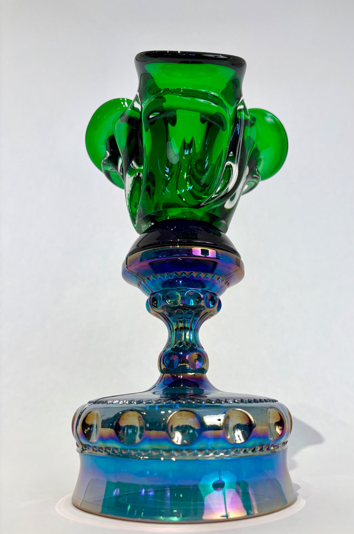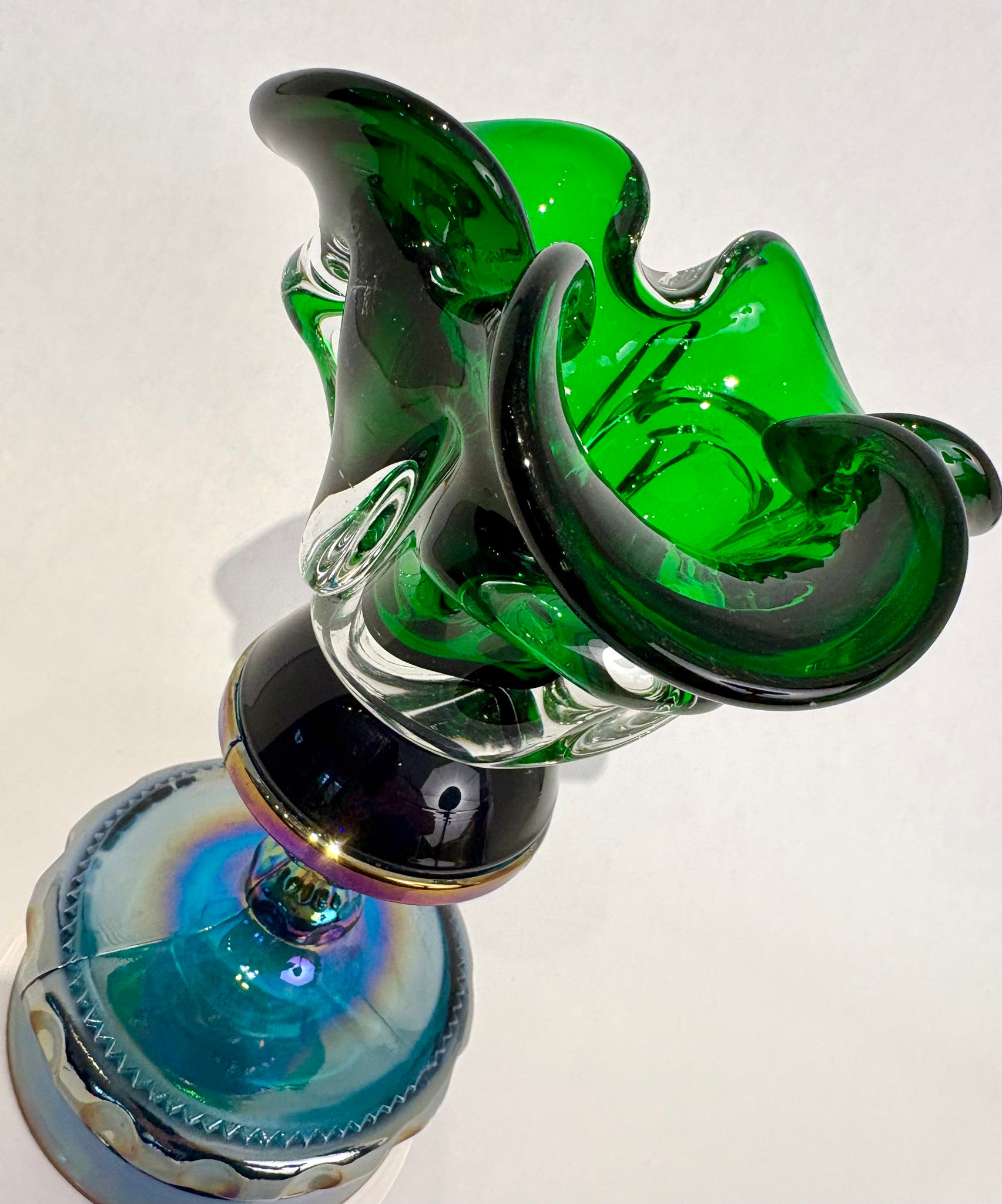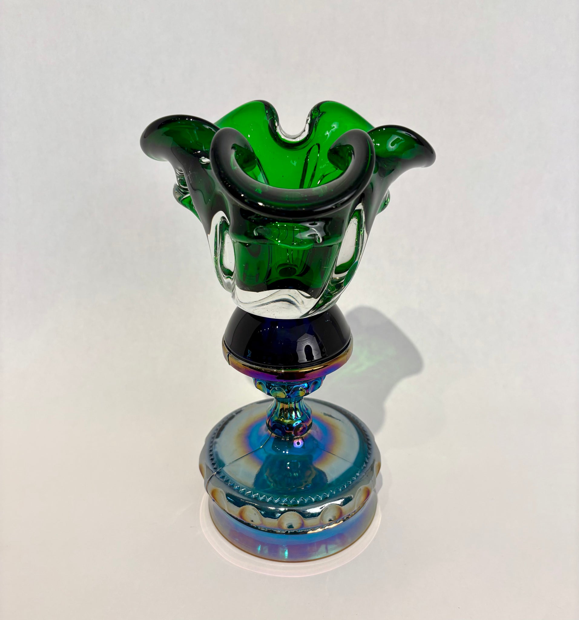 Moyenne empilade réalisée à partir de verrerie usagée portant fièrement la trace d'une vie bien remplie. Chaque élément a été choisi dans les bazars et brocantes des environs. Le tout a été soigneusement assemblé afin de donner vie à cette petite sculpture de verre qui pourra colorer la lumière dans votre décor.