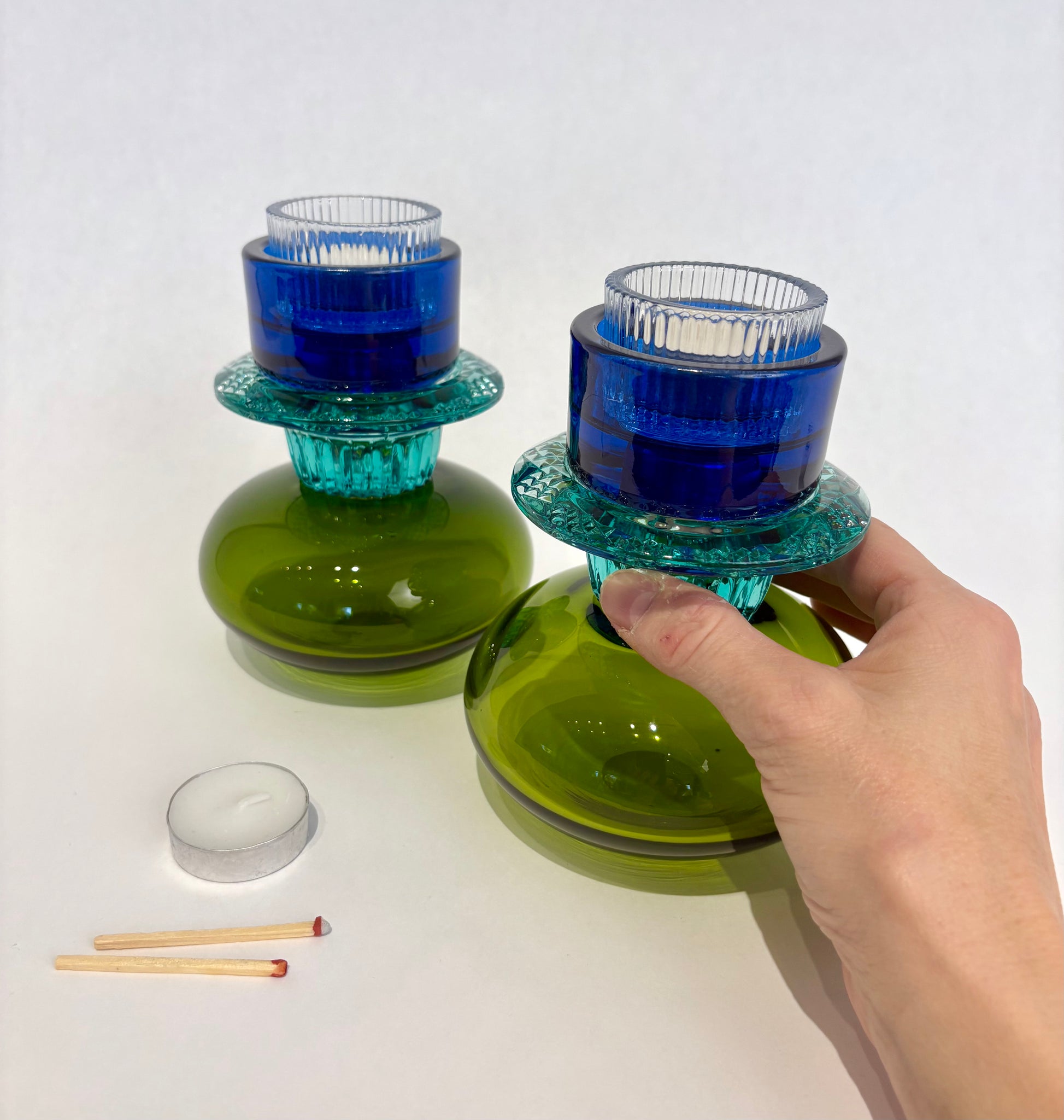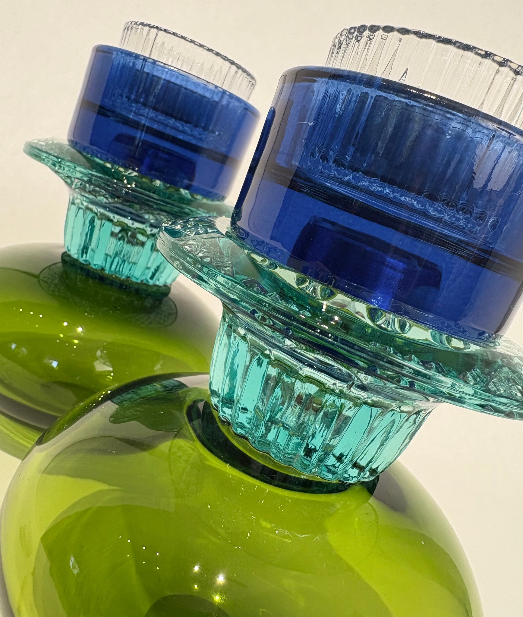 Paire de petites empilades réalisées à partir de verrerie usagée portant fièrement la trace d'une vie bien remplie. Chaque élément a été choisi dans les bazars et brocantes des environs. Le tout a été soigneusement assemblé afin de donner vie à ces petites sculptures de verre qui pourront colorer la lumière dans votre décor.